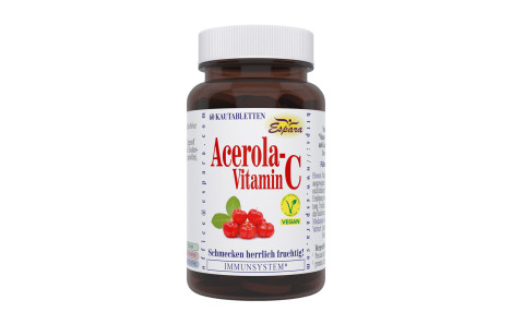 Nahrungsergänzungsmittel mit Vitamin C natürlichen Ursprungs. Acerola-Vitamin C Kautabletten schmecken herrlich fruchtig. Vitamin C trägt zur normalen Funktion des Immunsystems und zur normalen Kollagenbildung (Blutgefäße, Knochen, Knorpel, Zahnfleisch) bei und schützt die Zellen vor oxidativem Stress.