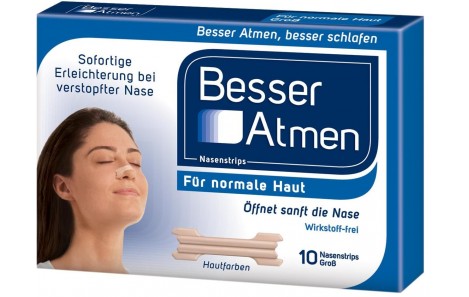 BesserAtmen Nasenstrips können sofortige Abhilfe bei Problemen mit der Nasenatmung schaffen, sie wirken rein mechanisch und sind daher frei von arzneilichen Wirkstoffen.