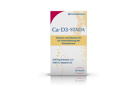 Ca-D3-STADA ist ein Nahrungsergänzungsmittel mit 500 mg Kalzium und 500 I.E. Vitamin D3 - speziell für Frauen ab 50 bei postmenopausal ...
