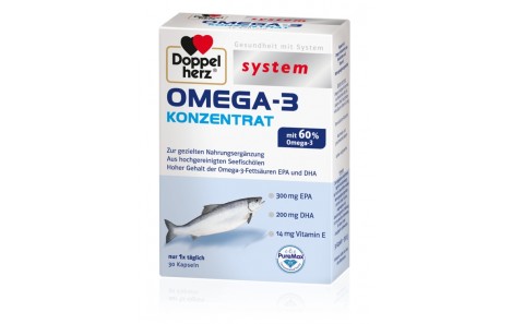 Die Doppelherz system-Kapseln enthalten 900 mg Omega-3-Konzentrat aus Seefischölen, das 60 % an Omega-3-Fettsäuren enthält. Viele andere herkömmliche Fischöle enthalten nur 30 % Omega-3-Fettsäuren. Aufgrund dieser hohen Konzentration von Omega-3-Fettsäuren verringert sich die tägliche Einnahmemenge auf nur 1 Kapsel täglich!