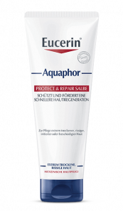 Eucerin Aquaphor Protect & Repair Salbe schützt, beruhigt und pflegt extrem trockene, rissige oder irritierte Haut und fördert eine schnellere Hautregeneration.