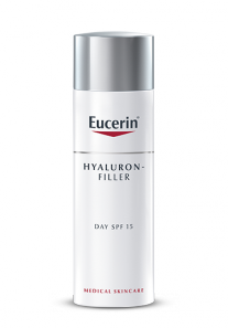 Eucerin HYALURON-FILLER Tagespflege ist eine Tagescreme mit Hyaluron für normale Haut bis Mischhaut – die innovative Anti-Age Pflege wurde speziell für diesen Hauttyp entwickelt. Die Tagescreme kombiniert die langkettige Hyaluronsäure mit 40 mal kleineren, kurzkettigen Hyaluronsäure-Molekülen und reduziert selbst ausgeprägte Falten sichtbar.* Saponin unterstützt zusätzlich die hauteigene Produktion der faltenauffüllenden Hyaluronsäure. Zusätzlich beugen LSF 15 und UVA-Schutz wirkungsvoll der vorzeitigen Hautalterung und der Vertiefung bereits vorhandener Falten vor. Die Haut sieht glatter und jugendlicher aus. Die Hyaluron Tagescreme ist sehr gut als Make Up Grundlage geeignet.