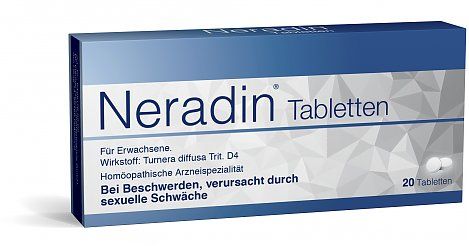 Neradin® Tabletten ist ein rezeptfreies, zugelassenes Arzneimittel bei Beschwerden, verursacht durch sexuelle Schwäche. Darunter versteht man z.B. Erektionsstörungen. In Neradin® ist ein aktiver Wirkstoff enthalten, der sich durch seine gute Verträglichkeit auszeichnet. Bei Neradin® sind keine Neben- oder Wechselwirkungen mit anderen Arzneimitteln bekannt. Ein weiterer Vorteil: Neradin muss nicht zu einem bestimmten Zeitpunkt vor dem Sex genommen werden. Dadurch wird spontaner Sex wieder möglich.