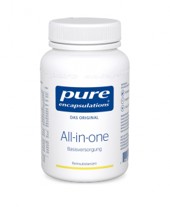 Der Lebensstil sowie das Ernährungsverhalten sind Faktoren, die den individuellen Mikronährstoffbedarf bestimmen. So kann insbesondere eine Zufuhr von Vitamin D3, Folsäure, Beta-Carotin, Selen und Magnesium sinnvoll sein. All-in-one liefert Nährstoffe für die tägliche Versorgung und enthält zusätzlich CoQ10, Lutein sowie Polyphenole aus Traubenkern-Extrakt. Moderne Verbindungen gewährleisten eine ideale Aufnahme im Körper. Die Formel ist bestens geeignet, um die Ernährung zu ergänzen.